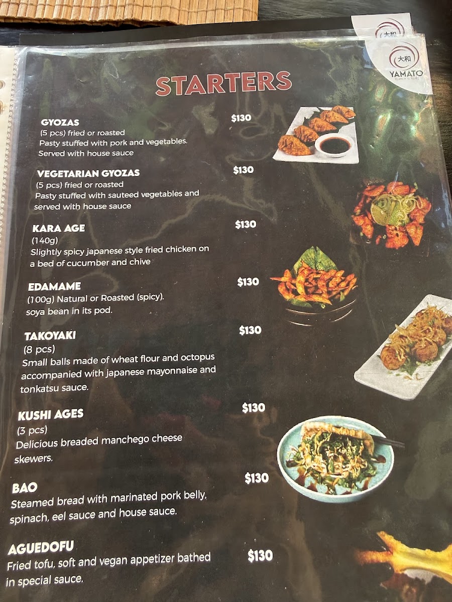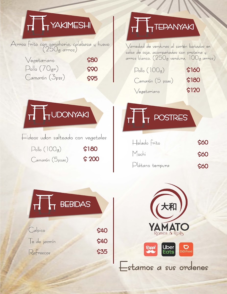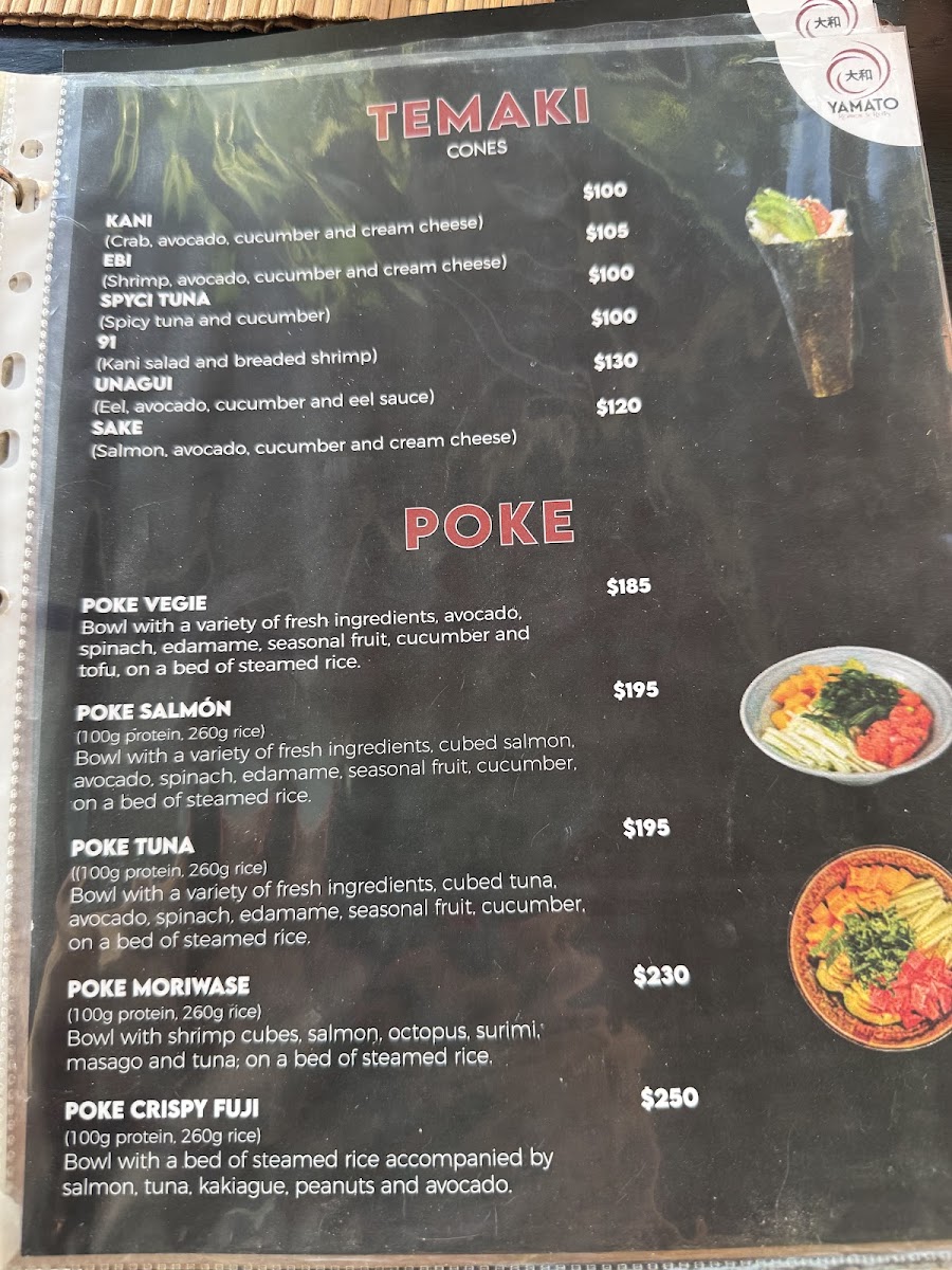 The menu at Yamato Ramen & Rolls offers a delightful array of dishes with a focus on Japanese flavors, perfect for sushi and ramen enthusiasts. The Temaki options include favorites like Temaki Unagui and Temaki Spicy Tuna. For poke lovers, the Poke Tuna and Poke Vegie are standout choices, while the Poke Moriwase offers a more varied selection. The Niguiri section includes options such as Niguiri Kani, Niguiri Ebi Camarón, and Niguiri Siake Salmón. If you’re in the mood for something cooked, the Tepanyaki Camarón and Tepanyaki Pollo are delicious choices, along with a Tepanyaki Vegetariano option for plant-based diners. The sushi menu features a range of rolls including the Sake Roll and Unagui Roll. For something more indulgent, the Plátano Tempura and Helado Frito are perfect desserts to finish off the meal. If you prefer a lighter start, the Edamame and Gyozas are tasty appetizers. For hearty main dishes, Yakimeshi Camarón and Yakimeshi Pollo provide satisfying rice options. The ramen selection is diverse, with offerings like Tempura Udon, Ramen Kai, and Vegie Ramen. The menu is well-balanced, with a blend of raw, grilled, and fried options, ensuring there's something to suit all tastes.