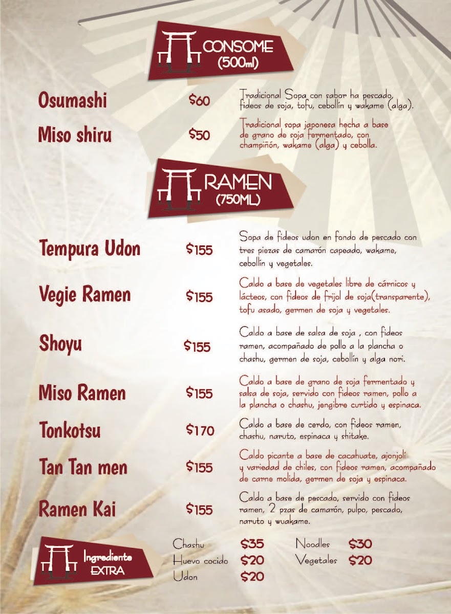 Caldo a base de salsa de soja y pollo, con fideos ramen, acompañado de pollo a la plancha o chashu, germen de soja, cebollín y alga nori.